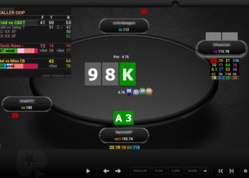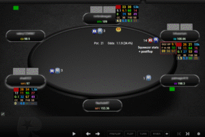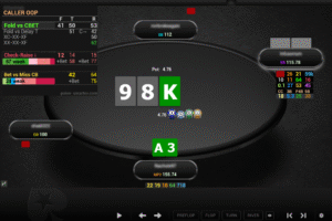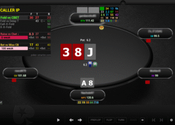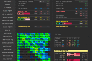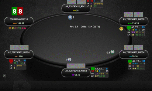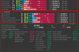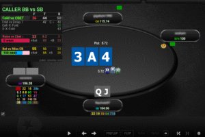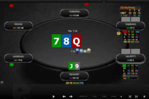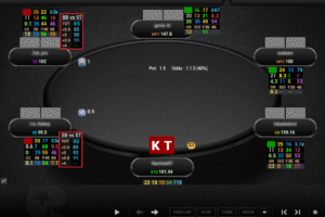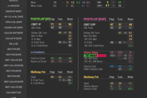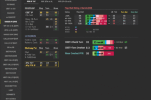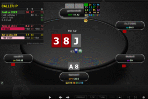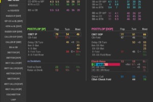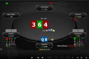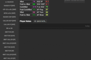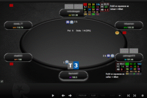 Rápidamente podemos visualizar sus stats en la SB desde el HUD principal, este jugador en particular tiene un ColdCall de 7% y un 3Bet del 6% (vs MP). Una vez hacemos call al 3bet, se abrirá el panel “3BET BL vs EP-MP” con las stats más importantes, su Cbet, Cbet-Fold vs un raise, checks, etc. Todo automatizado y sin la necesidad de abrir popups ni buscar estadísitcas.
