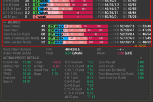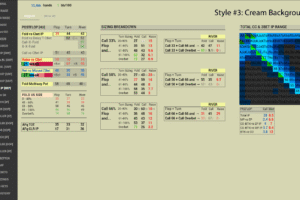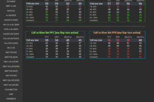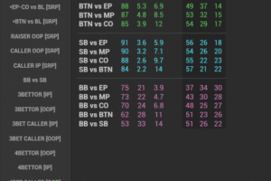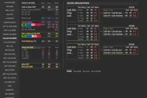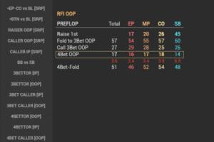Cuando te encuentres en BTN o SB, los paneles preflop de “vs Steal” aparecerán automáticamente y podrás vercuanto foldean los oponentes en las ciegas; el TOTAL y contra diferentes sizings.