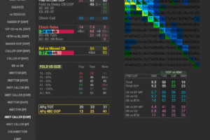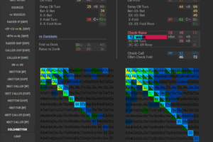 Hacemos Open Raise en SB vs BB y la BB nos paga. Automaticamente el panel de “Caller BB vs SB” aparecerá y tendremos a disposición las estadísticas Postflop mas importantes en este spot, junto con diagramas muy visuales para visualizar la composición y la fuerza de sus acciones.